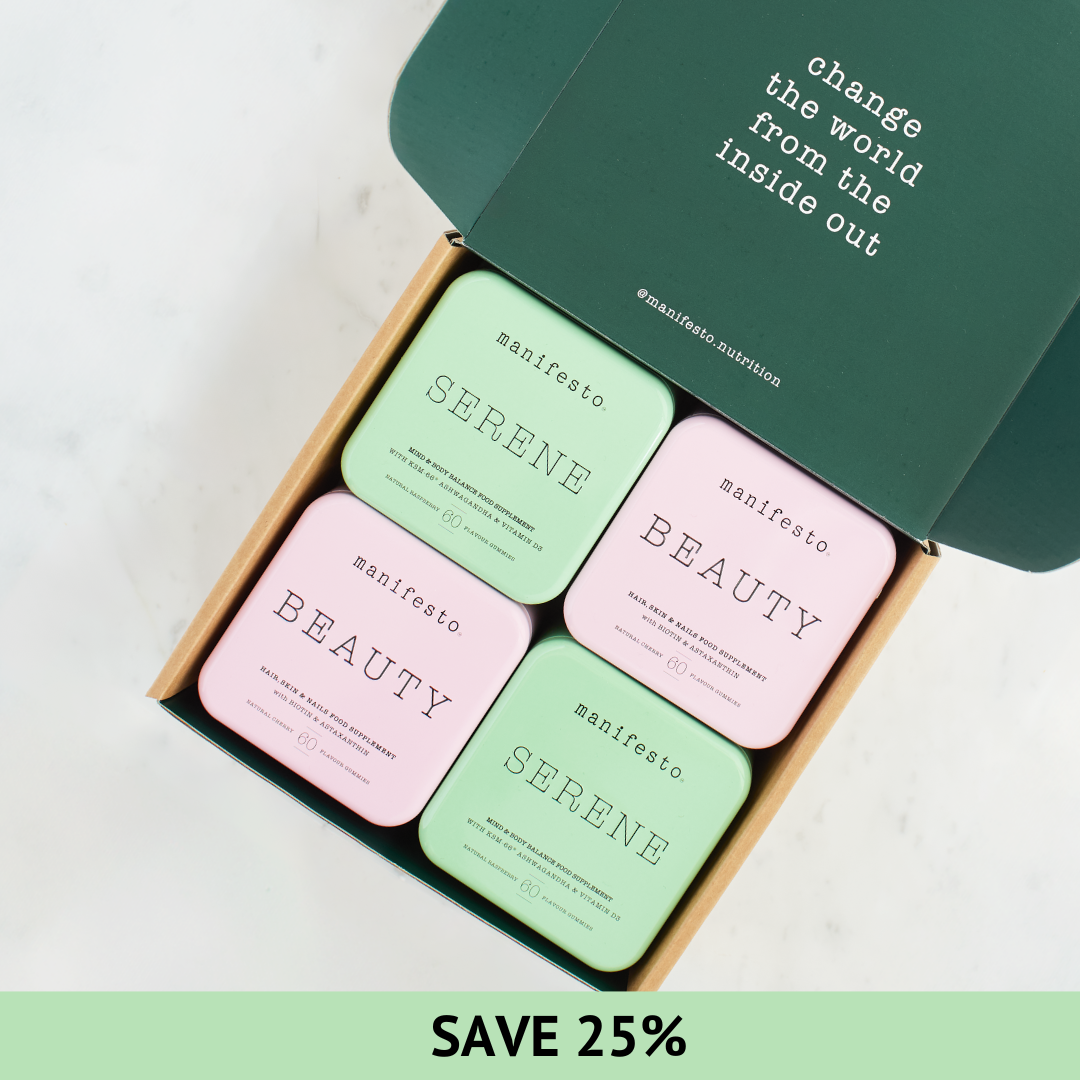 This thoughtfully curated set includes a two-month supply of both our Serene and Beauty supplements.