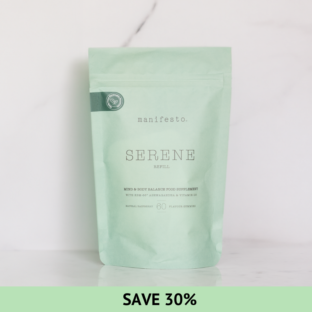 Already have your beautiful keepsake Manifesto Serene tin? Keep the calm going with Serene vitamin refill gummies, Wild Raspberry flavoured—now available in eco-friendly, bio-based, pouches. Packed with Vitamin D3, Ashwagandha KSM-66, Lemon Balm Extract, and Jujube Seed Extract and more, these gummies help regulate hormone activity, reduce stress, and support mood, and improve sleep.